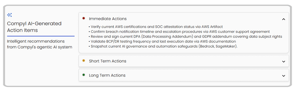 Intelligence without direction, though, is just data. That is why Vendor Insights does not stop at surfacing risk — it generates prioritized action recommendations for each vendor profile, organized into immediate, short term, and long term actions. Your team reviews the findings and decides what to act on. The recommendations give you a starting point that would otherwise take hours to develop manually.