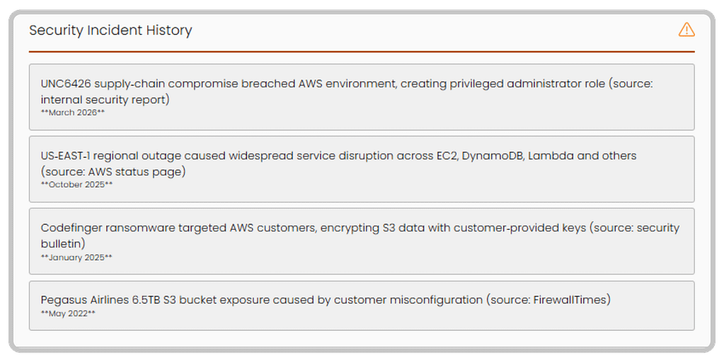 In March 2026, Iranian drone strikes physically destroyed three AWS data centers in the UAE and Bahrain, knocking multiple availability zones offline and disrupting banking, payments, and enterprise software across the region. Any vendor with critical workloads in those facilities faced immediate operational impact — from a geopolitical and physical event invisible to any cyber score.