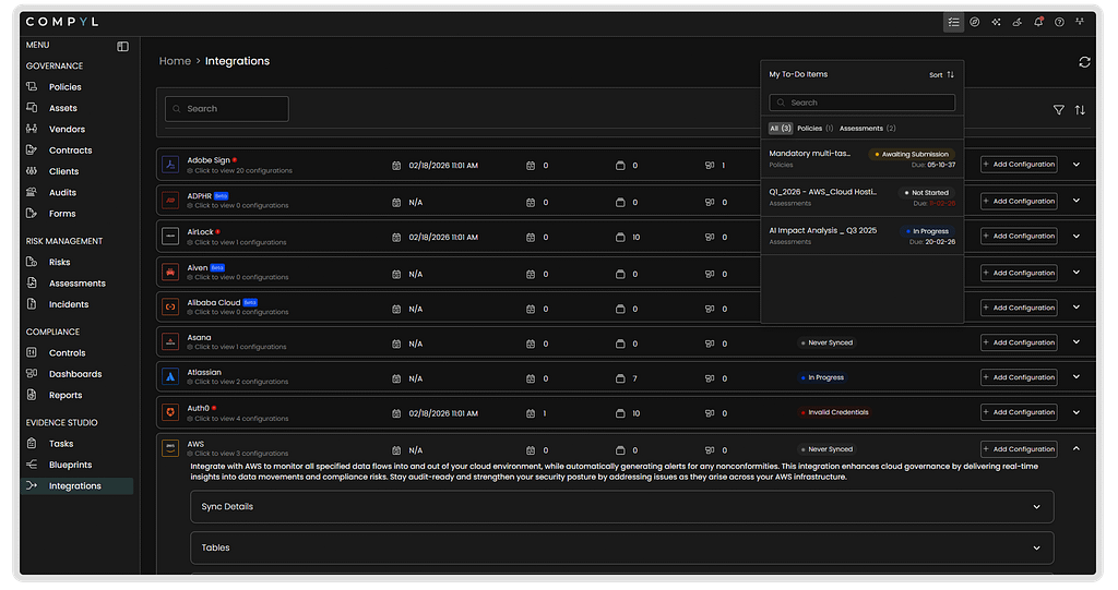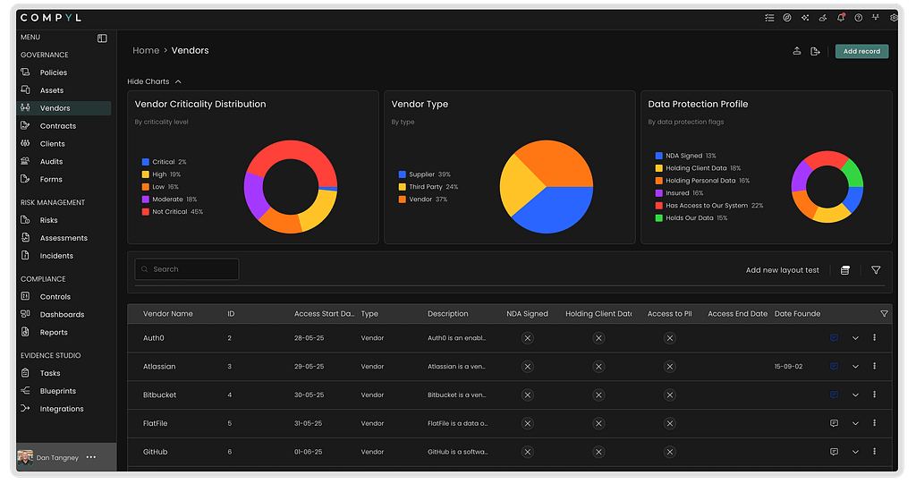 When GRC requires heroics, something is wrong. Compyl eliminates the daily struggle with real-time program status at a glance, fueled by connected data and live proof instead of screenshots or stale reports. AI eliminates bottlenecks by drafting questionnaires, analyzing vendor risk, and answering questions instantly so work keeps moving. Your team sees what matters, takes action immediately, and focuses on strategic decisions instead of manual processes. Start fast, scale easily with GRC that moves at the speed of your business.